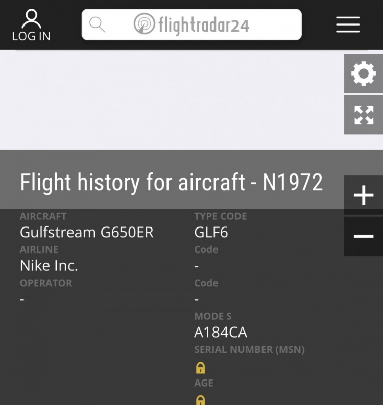 这架公务机的编号为N1972,根据在航空信息网站Flightradar24上查询到的飞机信息,这架飞机的机型为著名私人飞机湾流G650(Gulfstream G650ER),属于耐克公司所有。另外,此趟航班的起飞地波特兰也是耐克公司总部所在地。