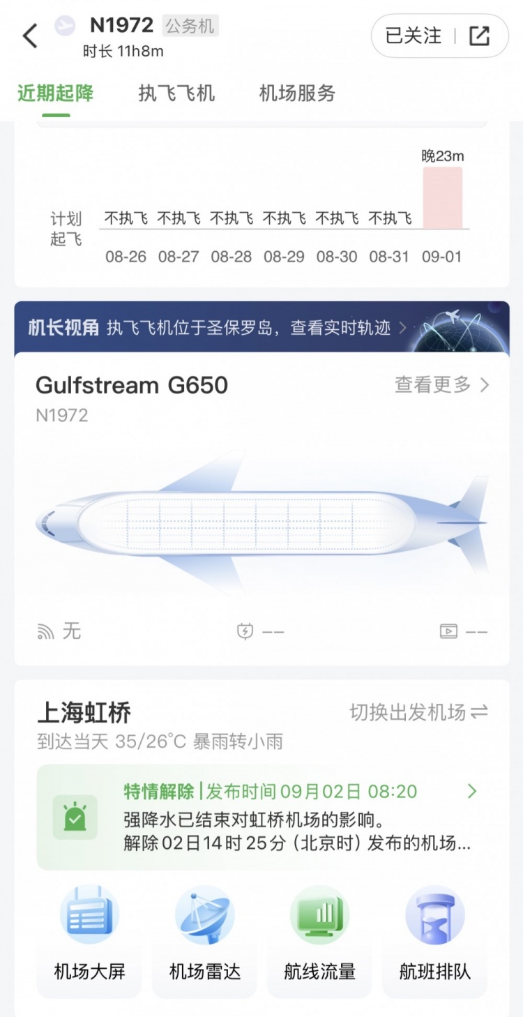 9月2日讯 根据“航旅纵横”、“飞常准”等航空出行App上所显示的航班信息,一架编号为N1972的公务机已经于当地时间21:23从波特兰国际机场起飞,预计将于北京时间今晚23:08飞抵上海虹桥机场,航程11时8分。
