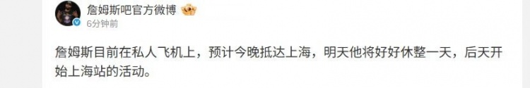 自媒体“詹姆斯吧官方微博”也发博确认道:“詹姆斯目前在私人飞机上,预计今晚抵达上海,明天他将好好休整一天,后天开始上海站的活动。”