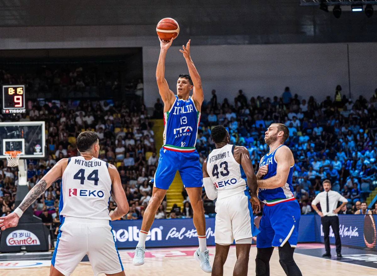 在末节比赛,意大利男篮一度将比分差距缩小到只落后6分。字母哥站了出来持球突破杀进内线将球放进。全场比赛还剩31秒,字母哥持球进攻,在篮下狭小的空间起跳,反手暴扣得分。全场比赛还剩5秒,字母哥再进一球,得分破30分锁定胜局。